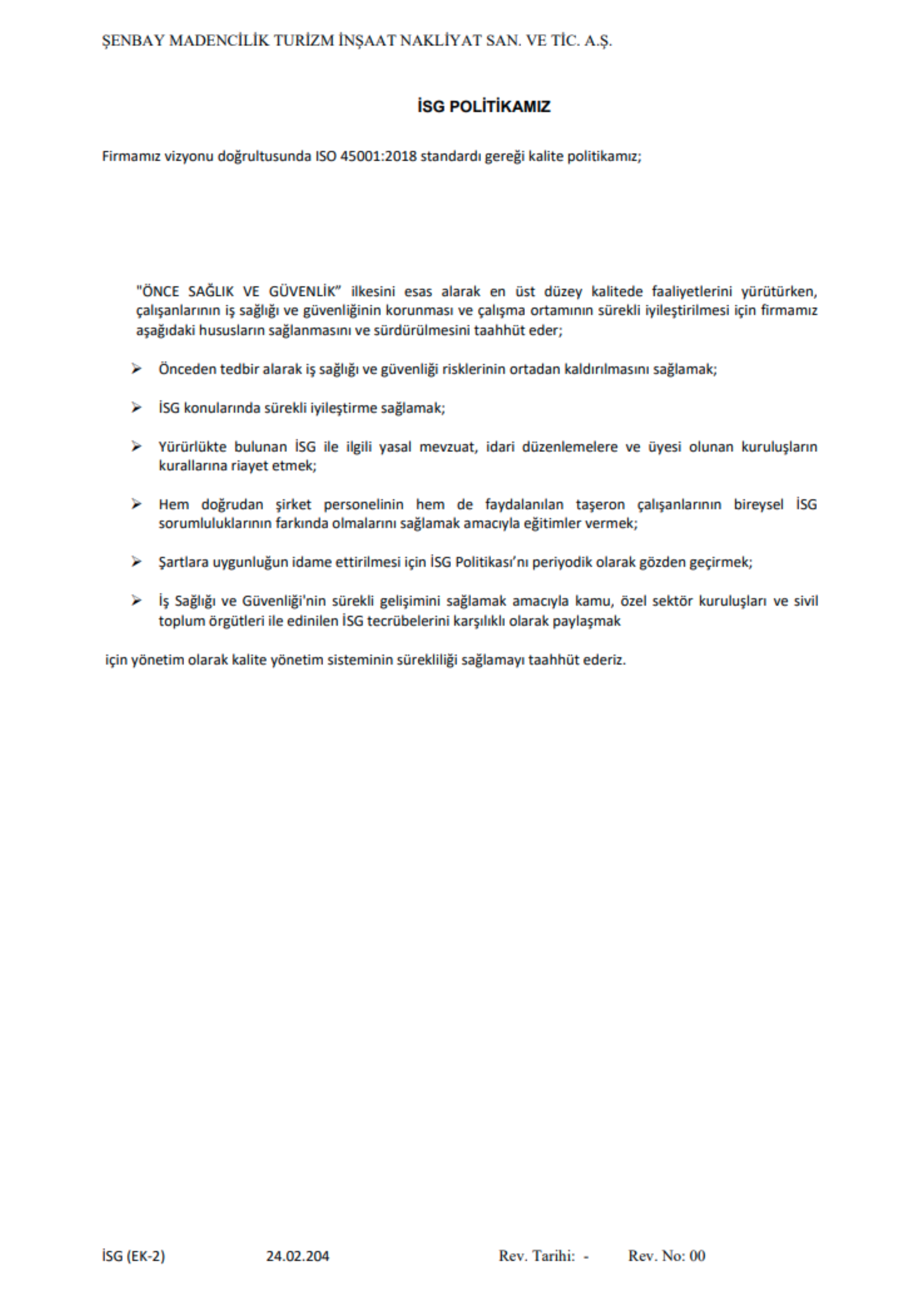 Şenbay Madencilik, ticari ahlaka önem veren dürüst, ilkeli ve inançlarına uygun davranışlarda bulunmayı çalışanlarına, iş ortaklarına ve işverenlerine taahhüt etmekte, böylece hem topluma hem de çalışanlarına fayda sağlamaktadır.
